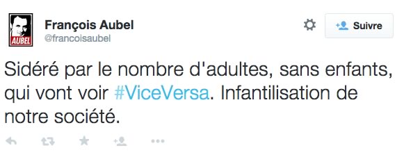 Le rédacteur en chef culture du Figaro se dit « sidéré qu'autant d'adultes se rendent voir Vice Versa sans être accompagnés de leurs enfants. Pour lui, ceci n'est rien d'autre qu'une preuve de l'«infantilisation de la société».